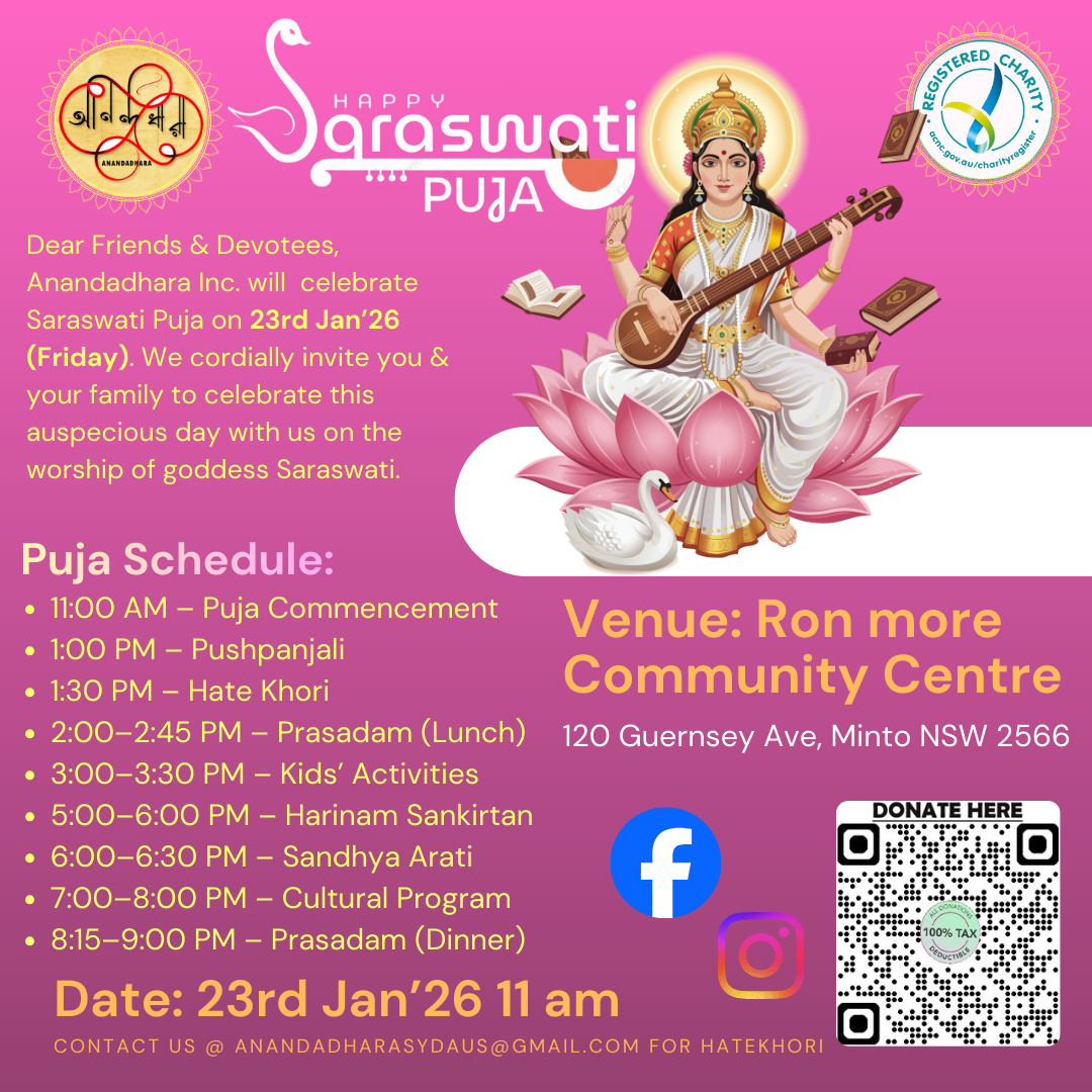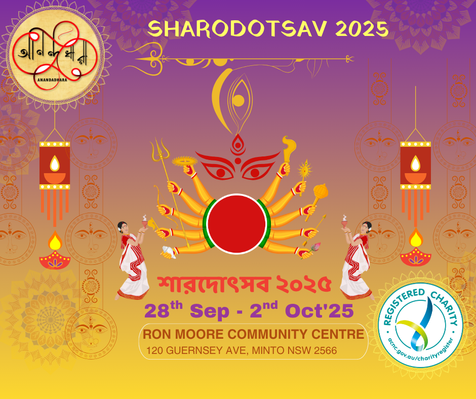 Anandadhara will celebrate 5 days long Sharodotsav from 9th to 13th Oct 2024 at Ron Moore Community Centre, Minto. We cordially invite you and your family to celebrate these auspicious days with us. Click "Details" button to see the schedule of the event.